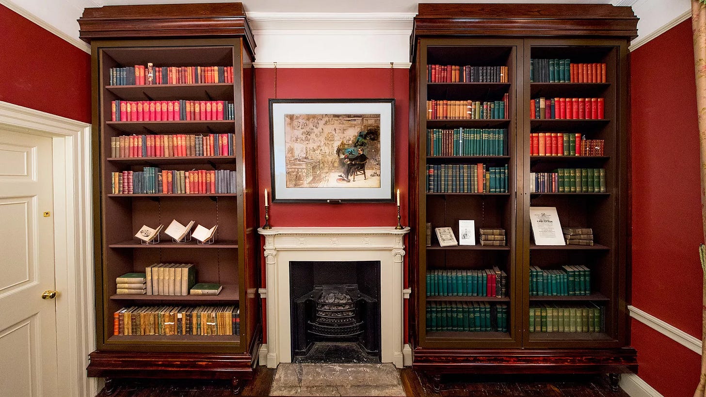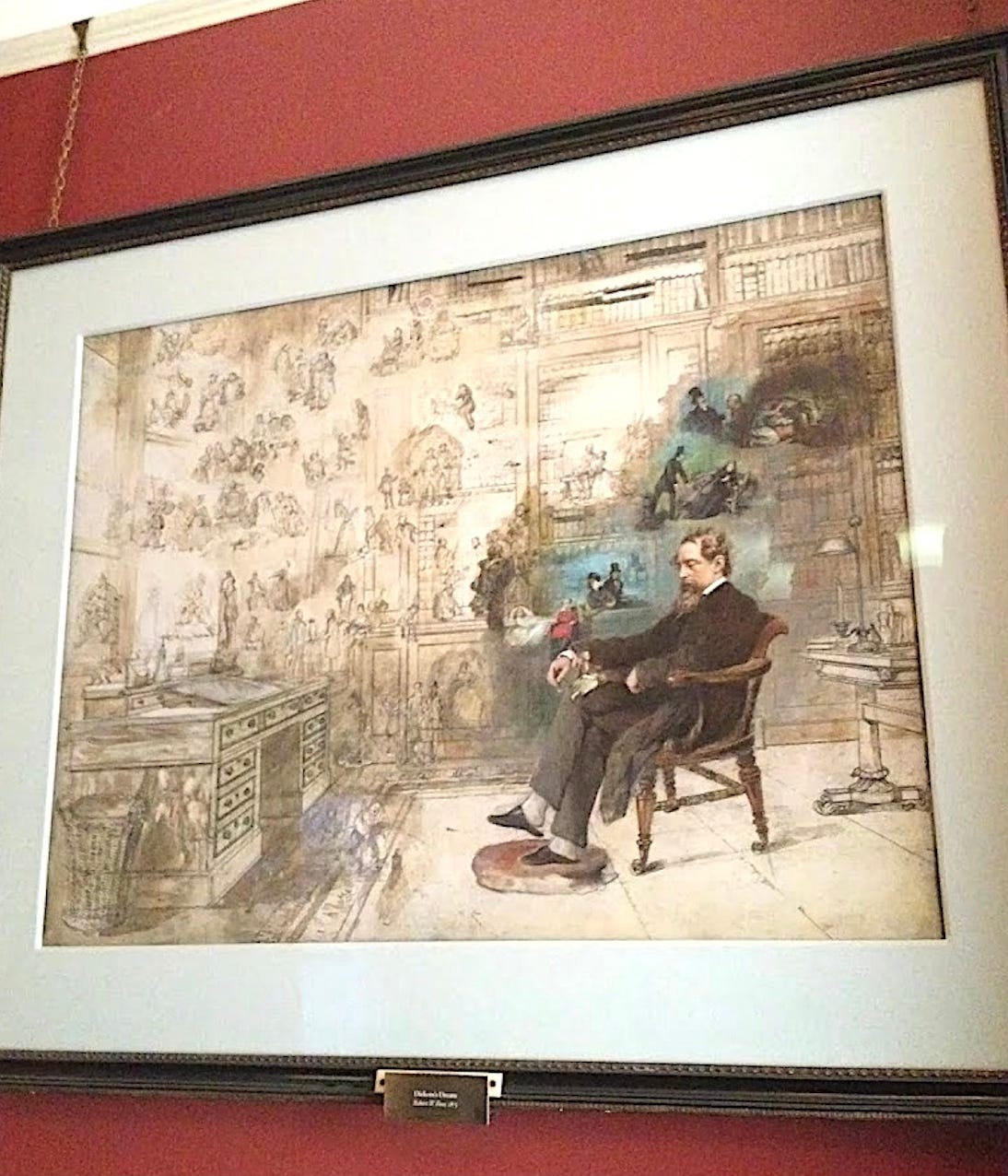Over the fireplace, I spot the famous watercolor in which Dickens sits in his chair, eyes closed, as over fifty small figures depicting his characters float above his desk and around him. The figures closest to Dickens are in color. The others recede into sepia tones. At first, the characters seem like enchanting fairies rising from the great writer’s dreams. But the longer I look in the shadowy light, they change. They become phantoms to me, like the wandering spirits that Marley shows to Scrooge. Imprisoned between worlds for eternity. When I recognize one of the figures closest to Dickens to be Little Nell on her deathbed from The Old Curiosity Shop, again I feel a rush of cold air. Stronger than before. I move to the other side of the study to step out of the draft. But now the whole room feels chilled. Maybe it will be warmer upstairs. I decide to come back later to the study.