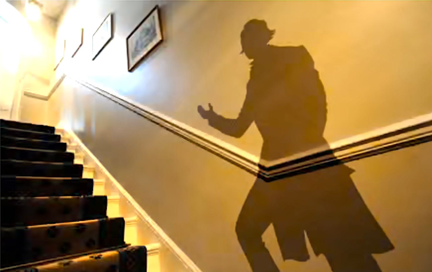 Passing the morning room with its portraits of young Dickens and his wife, Catherine, I see something odd. A gray silhouette of a man is painted on the wall at the base of the stairs, one foot poised on the first step, one hand gesturing toward the next floor. This flat spectral figure offends me. I don’t need this obvious invitation to imagine Dickens’ presence. It’s demeaning. And oddly disturbing. I quickly pass this shadow as I ascend the stairs.