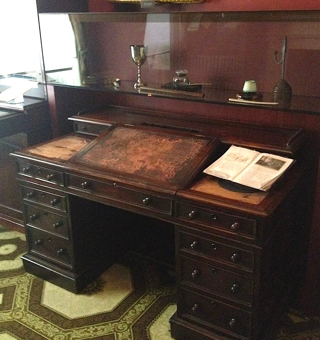 Dickens’ study is warm, welcoming, almost familiar. I stand next to his mahogany desk with its sloped writing surface. I see his glass inkwell always with blue ink. His goose quill pen. His silver magnifying glass. I imagine him spinning round to leap from his desk chair to act out his characters as he writes. I do the same thing because of him.