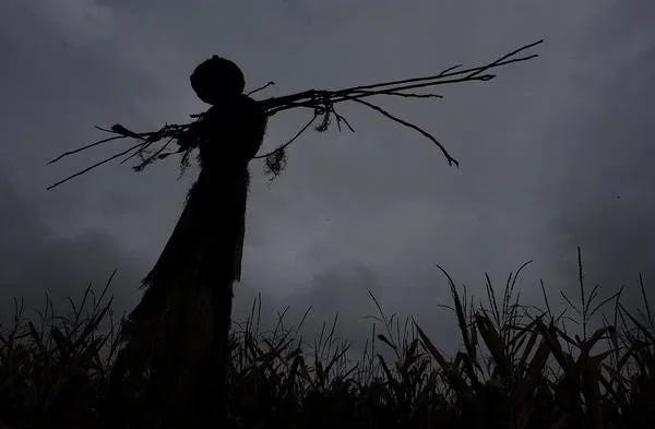Danny couldn’t see all of it, only the upper parts silhouetted against the window. It was tall, taller than he’d imagined it would be, its head or the thing that must have been its head nearly scraping the ceiling. It moved the way he’d once seen a praying mantis move, with long, impossible jointed arms bending and unbending, feeling the air. It stiffly turned its head toward him––mercifully, it was too dark to see its face. Danny felt sure that not only did the thing see him, but that it recognized him. It shook itself, and Danny could hear the rattling and thrashing of cornstalks in the wind, like the entire field was here in this room.